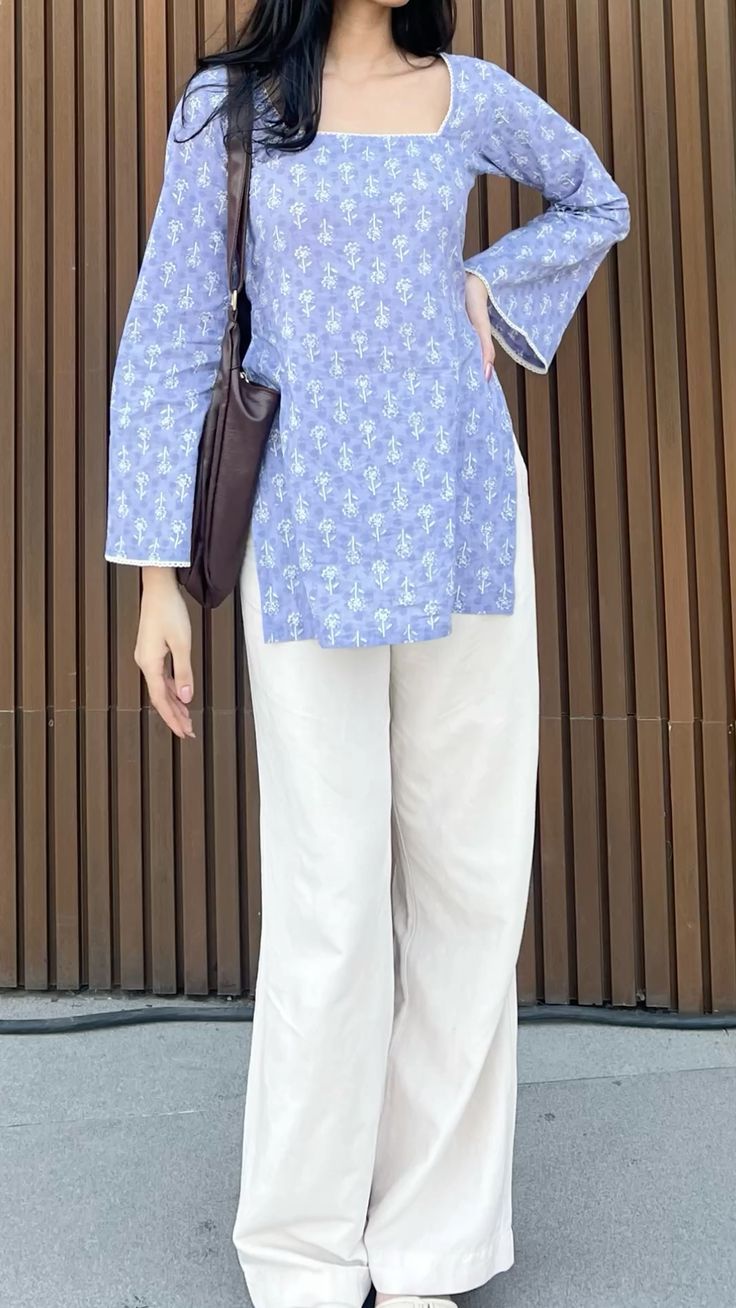 Style it with off-white wide-leg trousers as shown for a minimalist, sophisticated ensemble, or dress it down with your favorite pair of jeans for a chic, boho-inspired aesthetic. This kurti is a must-have for those who appreciate understated beauty and timeless design.