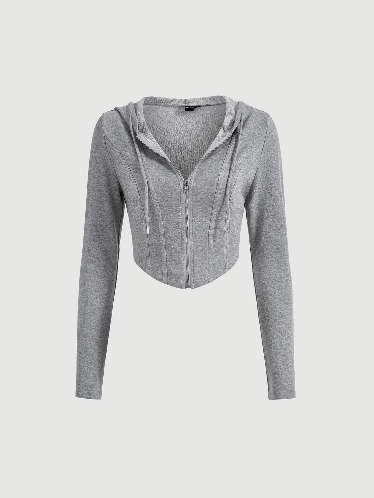 Upgrade your casual collection with a piece that balances comfort and high-fashion edge. Our Grey Marled Zip-Up Corset Hoodie takes the classic zip-up and reimagines it with a feminine, structured twist. The bodice features vertical seams designed to mimic the look of a corset, leading down to a sharp, curved hem that sits perfectly at the waist to highlight your figure.