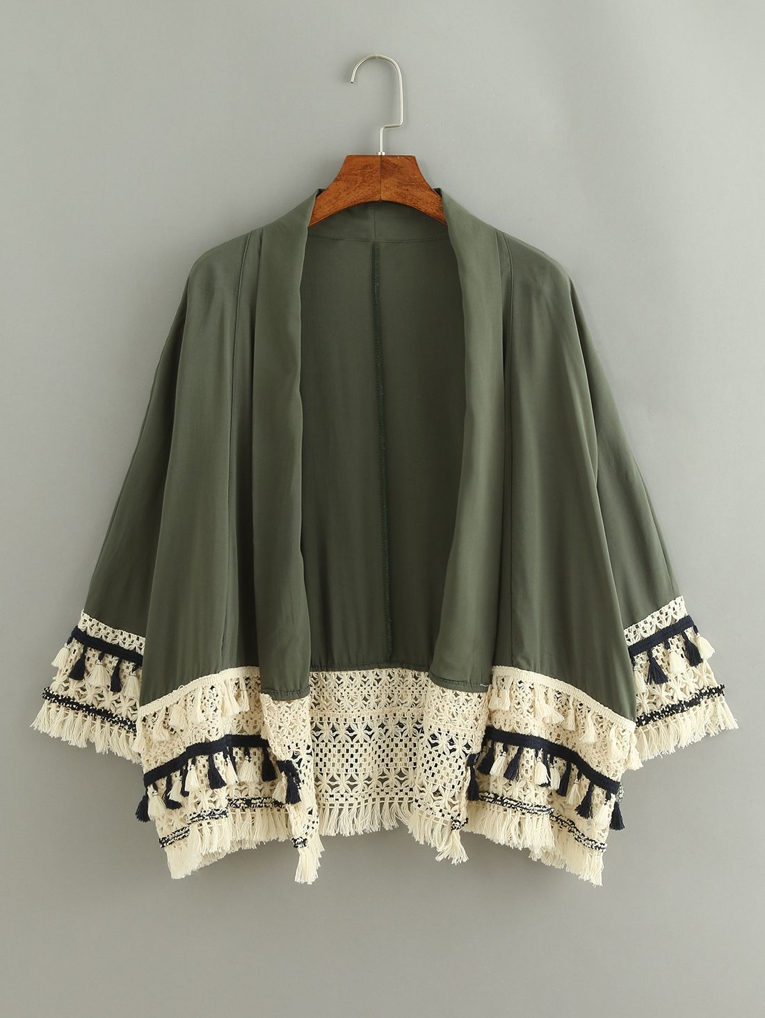 Olive Green Bohemian Kimono Cardigan with Crochet Tassel Trim