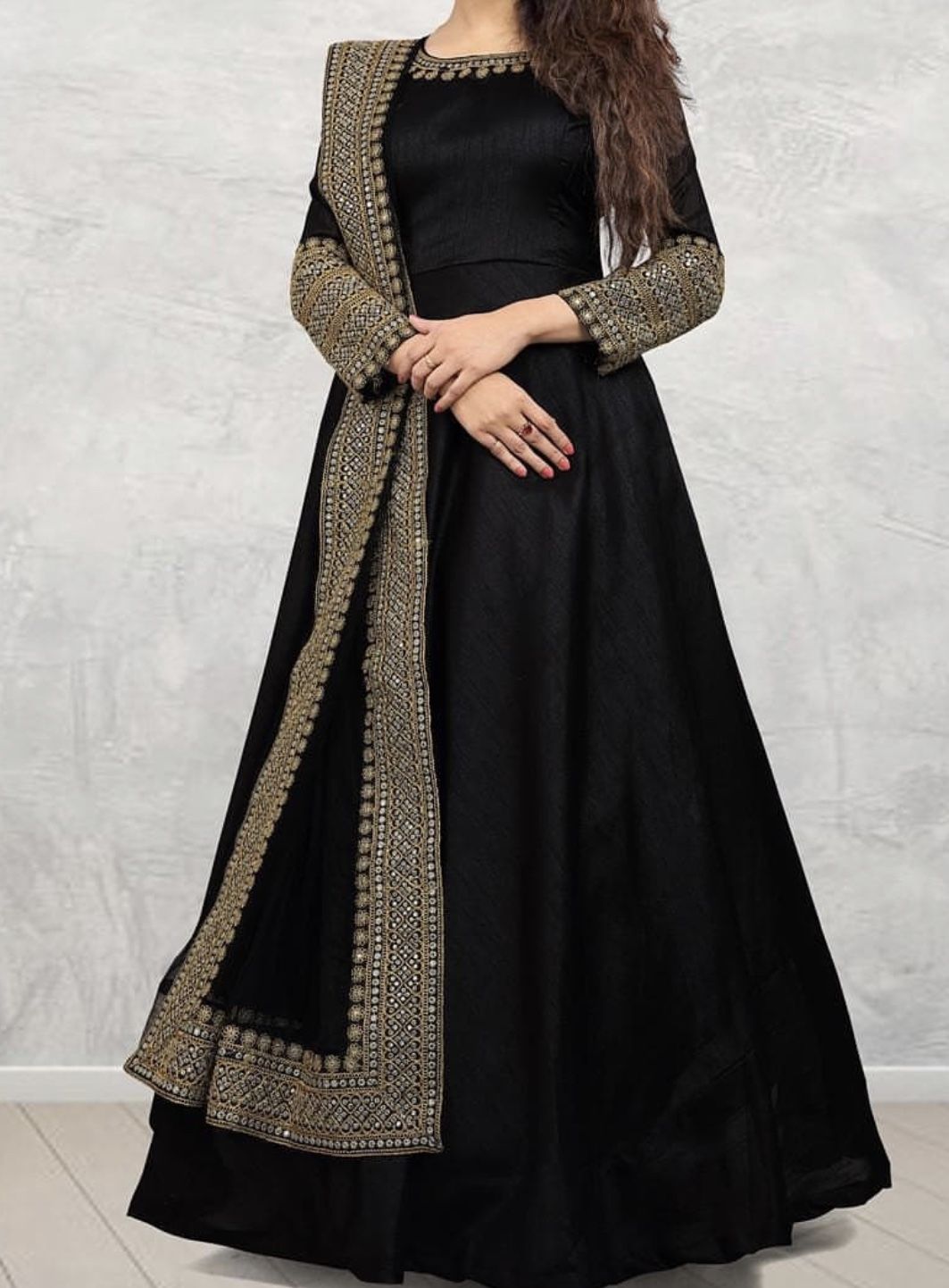 Channel timeless elegance at your next formal event with our Regal Black Silk Anarkali Gown. This masterpiece is designed for the woman who loves a blend of minimalist color and maximalist detail. The deep black silk fabric provides a dramatic backdrop for the intricate golden zari and mirror-work embroidery that adorns the sleeves, neckline, and dupatta.
