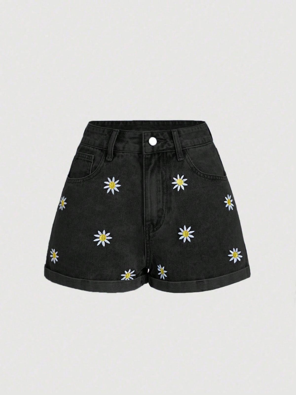 Women’s High-Waisted Daisy Embroidered Denim Shorts – Black